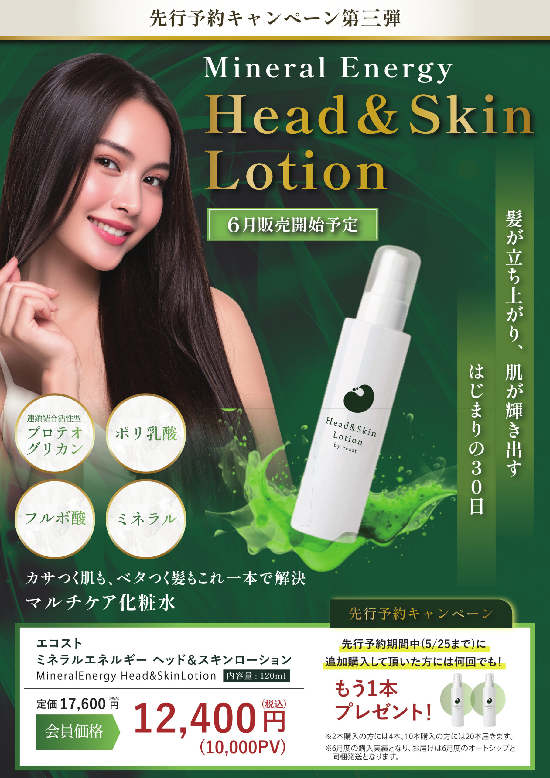 MEシリーズヘッド&スキンローションの発売を記念して、前回も大好評だったお得な先行予約キャンペーンを行います。 4月度、5月度の先行予約期間にて追加購入していただいた方には、もう1本プレゼントになります。 期間中何回でも購入可能。2本購入の方へは4本、10本購入の方へは20本のお届けとなります。